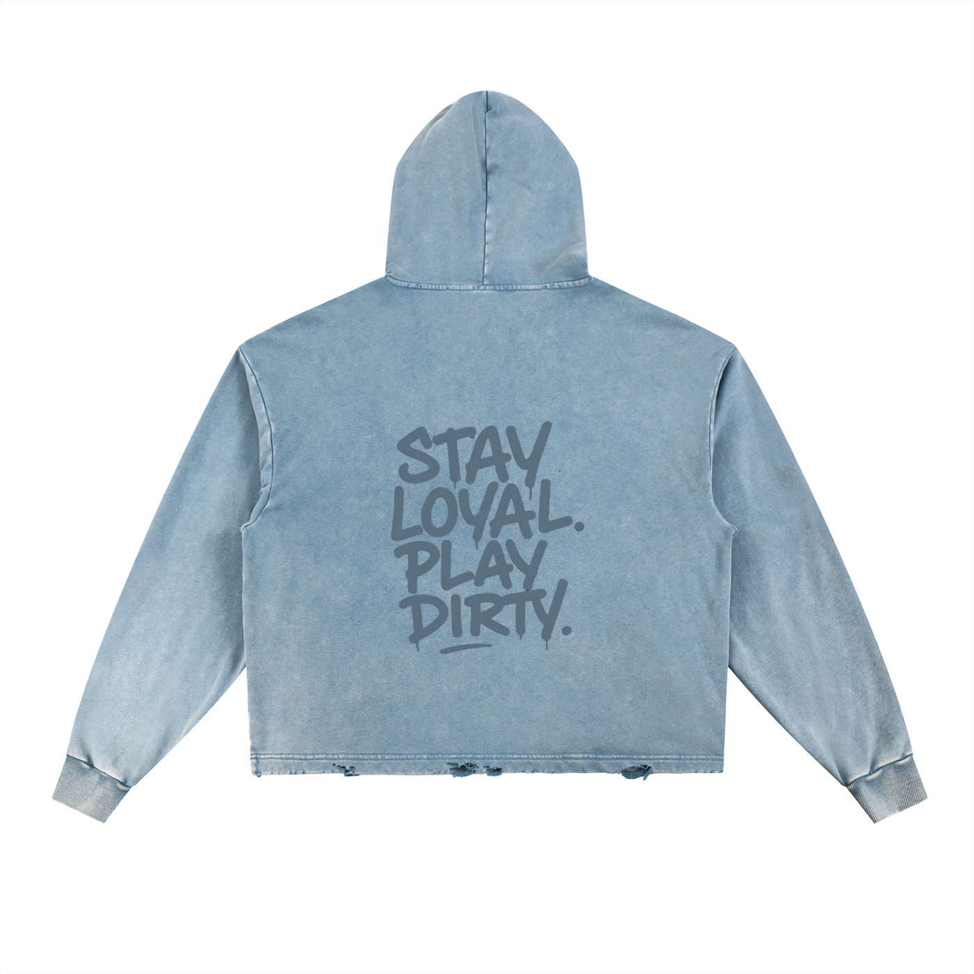The Vintage Washed Frayed-Hem Hoodie with blue text is built for the pack that doesn’t follow rules—only instincts. With its raw-cut hem, sun-faded wash, and bold printed graphic, this hoodie feels like it’s already lived a hundred stories.